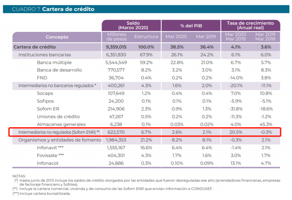 根据CNBF发布的《2020年财务储蓄和融资报告》中显示,截至2020年3月,总体放贷金额为9.4万亿比索,相比2019年增加4.1%。其中,银行机构提供的信贷仍占大部分,为6.4万亿比索,相当占该国GDP的26.1%。其中SOFOM ENR放贷金额为6.2千亿比索,相当占该国GDP的2.6%。值得关注的是其贷款额的年增长率,相比2019年增加20.5%,增长幅度相当可观,是在其所有金融机构中,增长幅度最高的金融实体。从下方标红的部分也可以看出,SOFOM ENR在总体放贷市场上,占比越来越高,重要性日增。